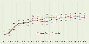 روند سالانه رتبه ایران از نظر تعداد انتشارات در نمایهنامههای وب آو ساینس و اسکوپوس- منبع سامانه نما