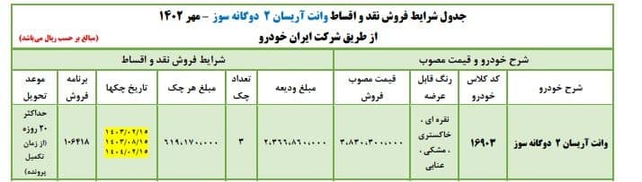 متقاضیان ثبت نام ایران خودرو در مهرماه ۱۴۰۲ میتوانند وانت آریسان دوگانه سوز را به صور اقساطی خریداری کنند. موعد تحویل این خودرو ۲۰ روزه اعلام شده است. همچنین ثبت نام پژو پارس با موتور XU۷YP نیز با موعد ۳ ماهه هنوز ادامه دارد. ایران خودرو اطلاعیه ثبت نام تارا ۱۴۰۲ را نیز به تازگی اعلام کرده است. در ادامه جزییات شرایط هرکدام توضیح داده شده است.