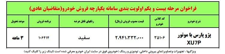 متقاضیان ثبت نام پژو پارس باید نصف مبلغ یعنی ۲۹۴ میلیون را به عنوان پیش پرداخت واریز کنند و مابقی مبلغ را زمان تحویل یعنی ۳ ماه دیگر بر اساس قیمت روز کارخانه محصولات ایران خودرو پرداخت کنند. رنگ پژو پارس نیز سفید است. مهلت ثبت نام پژو پارس تا روز سه شنبه مورخ ۱۴۰۲/۰۷/۲۵ ادامه خواهد داشت. فقط متقاضیانی که در سامانه یکپارچه ثبت نام کردند و اسامی ایشان به عنوان بخش سوم اولویت پاییز ۱۴۰۲ به این شرکت اعلام شده است می توانند برای ثبت نام پژو پارس اقدام کنند.