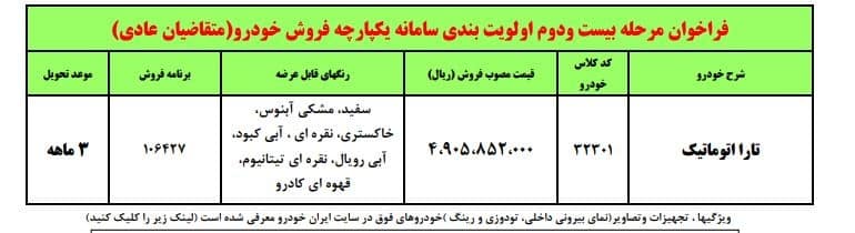 برای ثبت نام تارا اتوماتیک بایدیعنی ۴۹۰ میلیون تومان به حساب ایران خودرو واریز کنید. موعد تحویل ایران خودرو در این طرح ۳ ماهه اعلام شده است. مهلت فروش فوق العاده ایران خودرو برای این محصول تا ۲۷ مهرماه است.