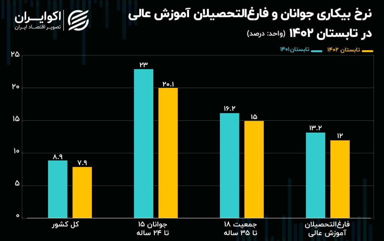 شواهد آماری حاکی از آن است که در تابستان سال گذشته یک میلیون و 643 هزار بیکار 18 تا 35 ساله در بازار کار ایران وجود داشته است. این جمعیت در تابستان امسال به یک میلیون و 520 هزار نفر کاهش یافته است. بر این اساس، نرخ بیکاری جمعیت 18 تا 35 ساله در دومین فصل امسال به 15 درصد رسیده که کمتر از مدت مشابه در سال قبل است.