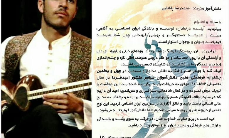 به گزارش پایگاه خبری یازاکو، این هنرمند بنابی توانست در چهل و یکمین جشنواره فرهنگی و هنری دانش آموزان سراسر کشور مقام اول رشته “تکنوازی تار” را به خود اختصاص دهد.