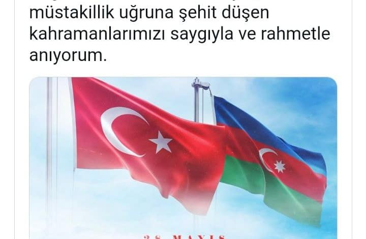 به گزارش واحد ترجمه پایگاه خبری یازاکو به نقل تی آر تی خبر رئیس جمهور ترکیه، در حساب کاربری خود از این جمله استفاده کرد: «با شعار یک ملت، دو دولت، روز استقلال برادر آذربایجان را جشن میگیریم، جایی که همیشه دوش به دوش یکدیگر هستیم و یاد قهرمانانمان را گرامی میداریم که در راه استقلال با احترام و رحمت به شهادت رسیدند.»
