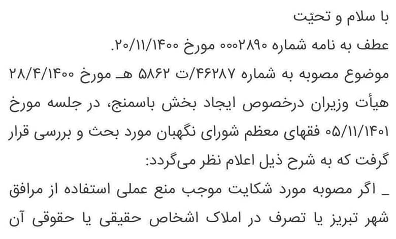 به گزارش پایگاه خبری یاز اکو؛ نظر شورای نگهبان قانون اساسی در خصوص تشکیل بخش باسمنج به دنبال شکایت شورای اسلامی و شهرداری تبریز مبنی بر مصوبه غیرقانونی و غیرفنی تشکیل بخش باسمنج، دیوان عدالت اداری، موضوع را از فقهای شورای نگهبان از بعد شرعی استعلام نمود. شورای نگهبان قانون اساسی، ضمن بحث و بررسی مصوبه بدین شرح اعلام نظر نمود: اگر مصوبه مورد شکایت موجب منع عملی استفاده از مرافق شهر تبریز یا تصرف در امکاک اشخاص حقیقی یا حقوقی آن محدود شود، در صورت عدم جبران خلاف شرع است. ضمن تشکر از زحمات و همراهی های همکاران شورای شهر، دکتر بیکی نماینده محترم شهر تبریز، دکتر یوسفزاده مشاور حقوقی شورا، همکاران شهرداری، معاونت شهرسازی و مدیریت حقوقی، انتظار می رود دیوان محترم عدالت اداری همچنان که در ادامه مصوبه شورای نکهبان تصریح شده، قاطعانه به ابطال مصوبه مذکور رای دهد.