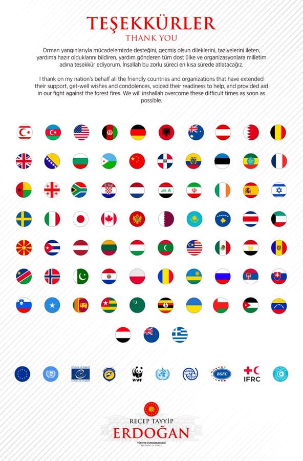 به گزارش پایگاه خبری یاز اکو به نقل آناتولی، رجب طیب اردوغان، رئیسجمهور ترکیه با انتشار پیامی در رسانههای اجتماعی از تمام کشورها و سازمانها بابت همبستگی و حمایت از تلاشهای ترکیه در مهار آتشسوزی جنگلهای کشور تشکر کرد.
