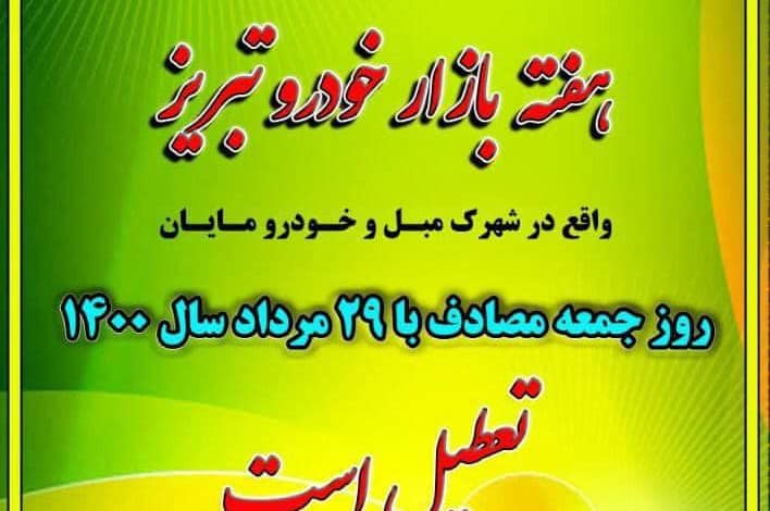 به گزارش پایگاه خبری یاز اکو به نقل از امور ارتباطات سازمان میادین و ساماندهی مشاغل شهری شهرداری تبریز: هفته بازار خودرو تبریز روز جمعه مصادف با ۲۹ مرداد سال ۱۴۰۰ طبق اعلام ستاد مبارزه با کرونا، جهت جلوگیری از شیوع ویروس کرونا تعطیل میباشد.