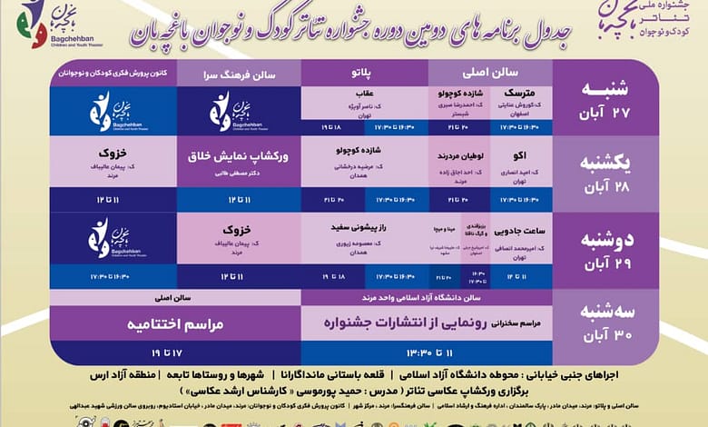 به گزارش پایگاه خبری یازاکو به نقل از دبیرخانه ی دائمی دومین جشنواره ی ملی کودک و نوجوان باغچه بان و بر اساس این جدول ، ده نمایش در بخش رقابتی صحنه ای روی صحنه خواهد رفت.