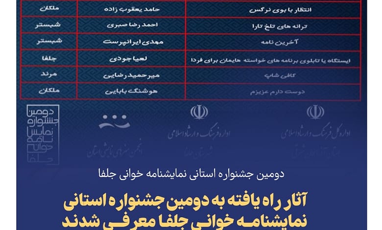 به گزارش پایگاه خبری یاز اکو به نقل از اداره فرهنگ و ارشاد اسلامی استان آذربایجان شرقی، براساس رای هیات انتخاب دومین جشنواره استانی نمایشنامه خوانی جلفا ، “مادام کامیون” به کارگردانی کریم پزشکی از عجب شیر ، “تو دهنتو می بندی یا من ؟”به کارگردانی فاطمه حسینی از تبریز ، “انتظار با بوی نرگس “به کاگردانی حامد یعقوب زاده از ملکان ، “ترانه های تلخ تارا”به کارگردانی احمد رضا صبری از شبستر ،”آخرین نامه ” به کارگردانی مهدی ایران پرست از شبستر،”ایستگاه یا تابلوی برنامه های خواسته هایمان برای فردا ” به کارگردانی لعیا جودی از جلفا ،”کافی شاپ “به کارگردانی میرحمید رضایی از مرند، “دوست دارم عزیزم “به کارگزدانی هوشنگ بابایی از ملکان به این جشنواره راه یافتهاند.