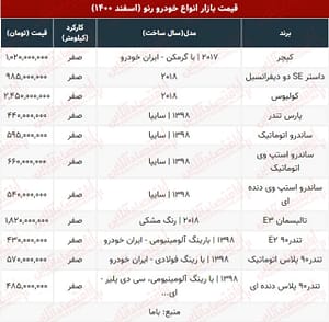 قیمت تندر۹۰ صفر E۲ مدل ۹۸ نیز حوالی ۴۳۰ میلیون تومان رسید که نسبت به ۴ روز گذشته ۵ میلیون ارزان شده است. این مدل ارزان ترین رنو بازار محسوب می شود. قیمت رنو کپچر حوالی یک میلیارد و ۲۰میلیون تومان ثابت ماند.