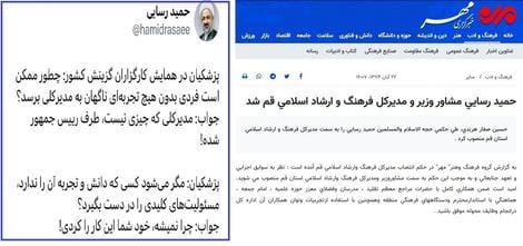1 – به نظر می رسد برخلاف آنچه پزشکیان گفته، می شود فردی بدون هیچ تجربه ای به مدیرکلی برسد. نمونه اش شخصی است به نام حمید رسایی که بدون تجربه خاصی ناگهان در دوران محمود احمدی نژاد، با حکم حسین صفار هرندی، وزیر وقت فرهنگ و ارشاد اسلامی، شد “مدیر کل فرهنگ و ارشاد اسلامی استان قم”!