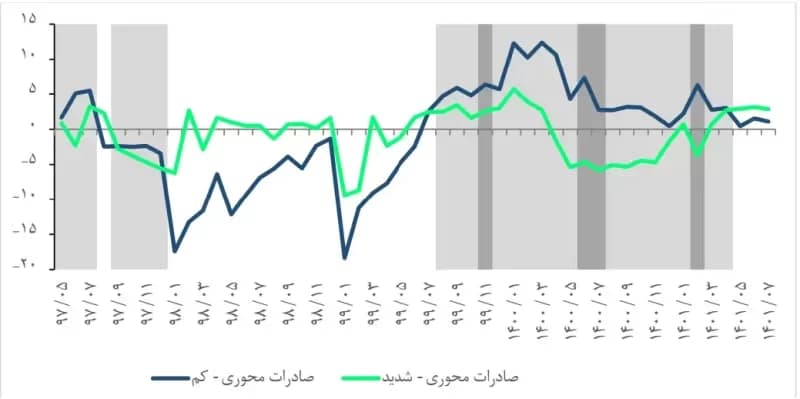 نمودار زیر یکی از نمودارهای منتشرشده در گزارش پژوهشکده پولی و بانکی است. منحنی سبز در نمودار درصد رشد ارزش تولید شرکتهای صادراتمحوری را نشان میدهد که وابستگی زیادی بر صادرات دارند.