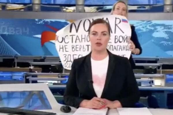 یک معترض روسی با پوستر ضد جنگ اخبار تلویزیون روسیه را قطع کرد