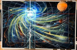 نمونه بارز این نگاه، تابلوی مفهومی «انفجار بزرگ» است که از سال ۱۳۷۸ آغاز شده و هنوز در حال شکلگیری است؛ تابلویی که بخشی از وصیت هنری استاد در پشت آن حک شده و خود میگوید تا پایان عمر، قلم از روی آن برنخواهد داشت