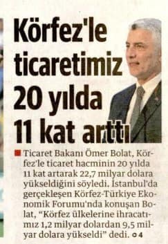 به گزارش یازاکو به نقل از عصر ترکیه و ینی شفق ، عمر بولات وزیر بازرگانی ترکیه در اظهاراتی در مجمع اقتصادی مشترک ترکیه و کشورهای عرب خلیج فارس در استانبول گفت حجم تجارت ترکیه با کشورهای عرب خلیج فارس در مدت 20 سال 11 برابر شده و به رقم 22 میلیارد و 700 میلیون دلار رسیده است.