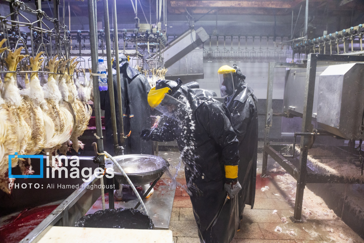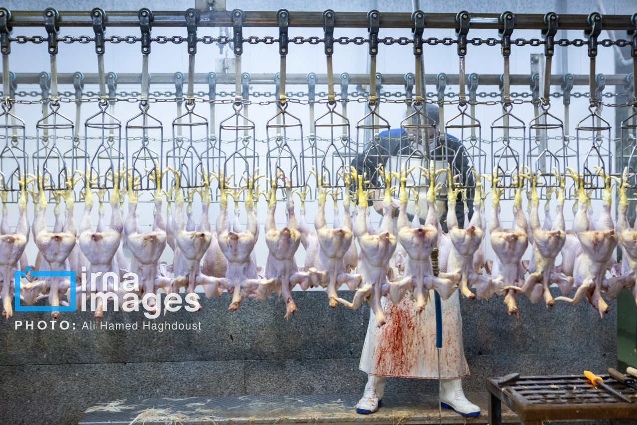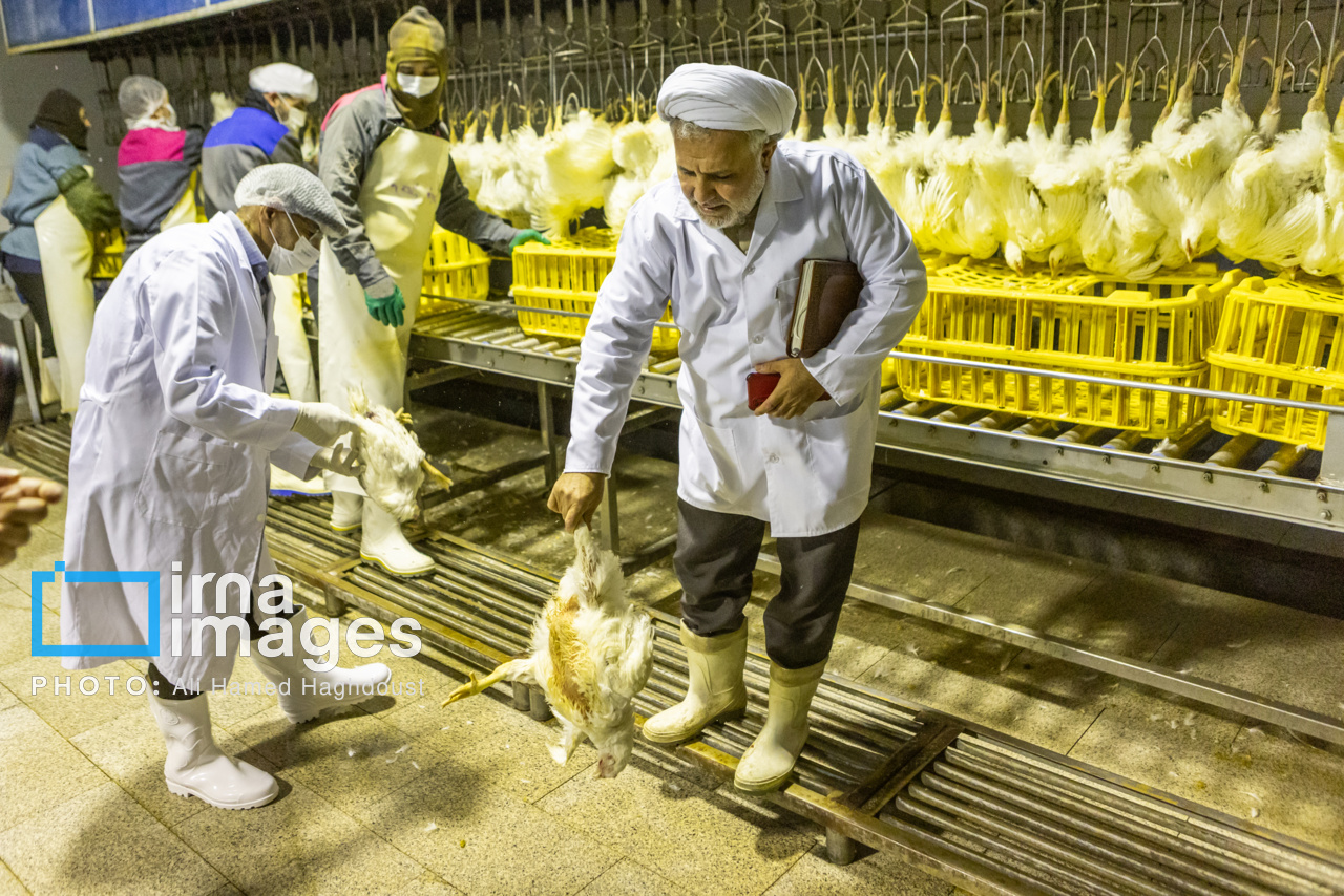 کنار دستگاه، حاج آقا محرم محمدزاده، روحانی و ناظر ذبح شرعی، مراحل اولیه تولید را چنین شرح میدهد: از اول بدو ورود در تخلیه بار، حیات حیوان را کنترل میکنیم. سپس در قلابزنی قبل از اینکه قلابزنی کنند، حیات حیوان باید برایمان محرز شود. مرغهای مرده معدوم شده به پودر خشک تبدیل میشود. حیوان زنده به حوضچه شوک رفته و در حین ذبح نظارت میکنیم که چاقو از زیر وداج (استخوان گلو، حلقوم) بخورد تا ذبح به صورت شرعی انجام شود. باید جزء روی سر بماند، اگر مری، نای و دو رگ (حلقوم) روی لاشه باشد، حرام است.