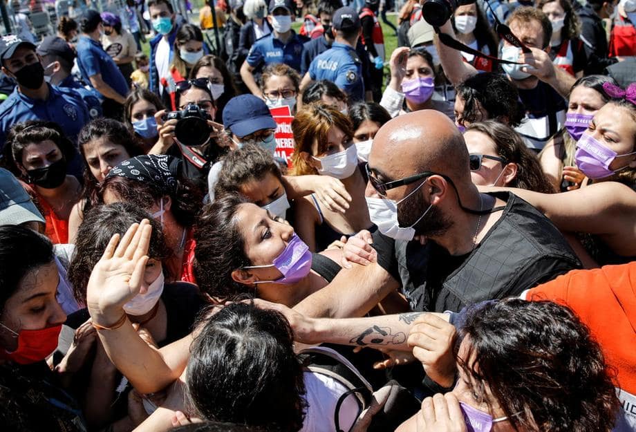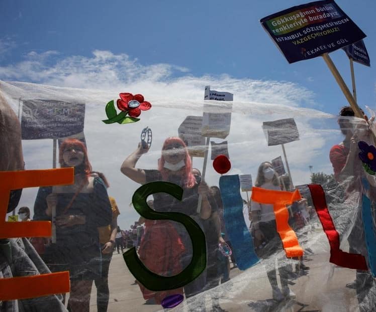 فعالان حقوق زنان در تظاهرات روز شنبه استانبول مخالفت خود با تصمیم دولت برای ترک “کنوانسیون استانبول” را نشان دادند/ عکس: رویترز