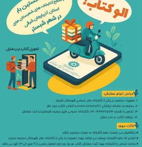 هادی محسنی رئیس اداره کتابخانههای عمومی شهرستان شبستر نیز از آغاز اجرای طرح «الو کتاب» از ابتدای مردادماه سال جاری خبر داد و افزود: این طرح با هدف ارائه خدمات نوین کتابخانهای و سهولت دسترسی شهروندان، بهویژه ساکنان مناطق دورافتاده یا فاقد کتابخانه، طراحی شده است.