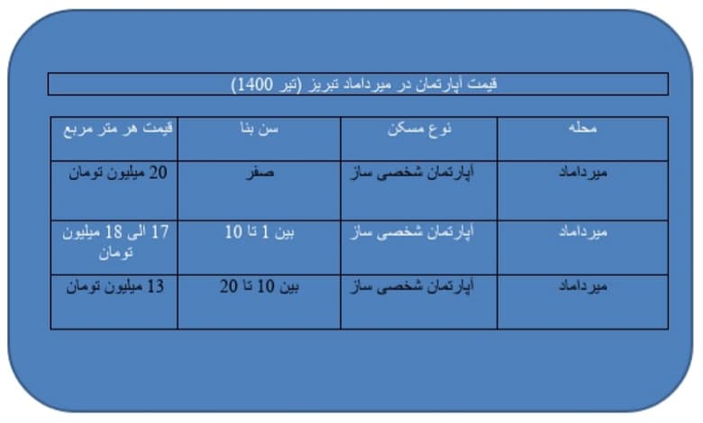 قیمت هر متر مربع آپارتمان در خیابان میرداماد تبریز بین 13 تا 20 میلیون تومان متغیر است.