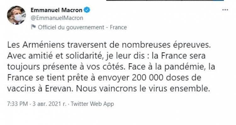 به گزارش واحد ترجمه پایگاه خبری یاز اکو به نقل از پرتال مطبوعات آز ماکرون طی توئیتی اعلام کرد: ارامنه با مشکلات زیادی روبرو هستند. با همبستگی و دوستی می گویم که فرانسه همیشه با شما خواهد بود. فرانسه ۲۰۰ هزار دوز واکسن را برای مقابله با این بیماری به ایروان ارسال می کند. ما با کمک هم با این بیماری مبارزه خواهیم کرد.