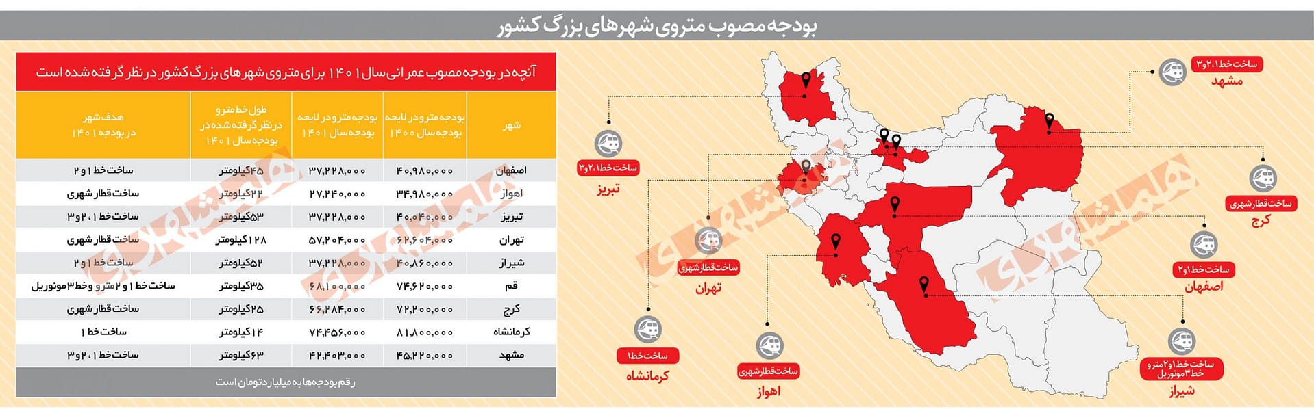 آنطور که رئیس شورای شهر تهران چند روز قبل در مشهد گفته بود بودجهای که به کل متروهای کشور در سال۱۴۰۱اختصاص یافته حدود ۵۰۰میلیارد تومان است. مهدی چمران معتقد است مثلا بودجه ۵۰میلیارد تومانی برای متروی تهران فقط به اندازه ساخت ۴۸متر مترو کافی است؛ همین نکته نشان میدهد وضعیت متروی باقی شهرهای بزرگ کشور چگونه است.