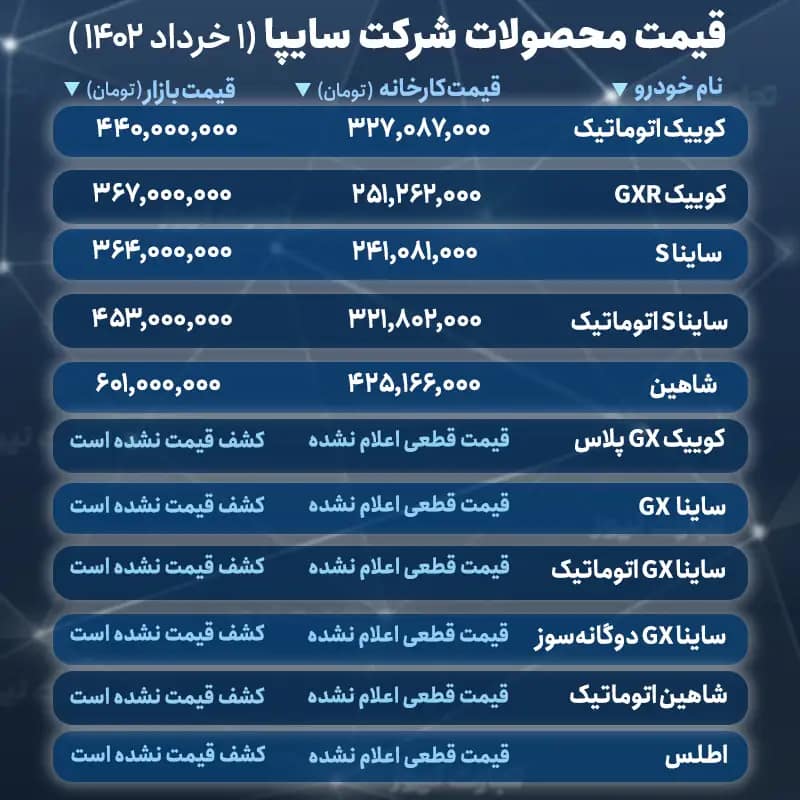 اطلس، کوییک اس (قیمت کارخانه ۲۶۸,۱۹۴,۰۰۰/ قیمت بازار ۳۶۵,۰۰۰,۰۰۰ تومان)، کوییک آر دندهای (قیمت کارخانه ۲۵۱,۲۶۲,۰۰۰/ قیمت بازار ۳۵۳,۰۰۰,۰۰۰ تومان)، ساینا اس دوگانهسوز (قیمت کارخانه ۲۸۳,۱۲۸,۰۰۰/ قیمت بازار ۳۸۷,۰۰۰,۰۰۰ تومان) و کوییک آر با گیربکس اتوماتیک (قیمت کارخانه ۲۸۸,۱۱۴,۰۰۰/ قیمت بازار ۴۳۵,۰۰۰,۰۰۰ تومان)، دیگر محصولات سایپا هستند که در طرح فرسوده عرضه شدهاند.