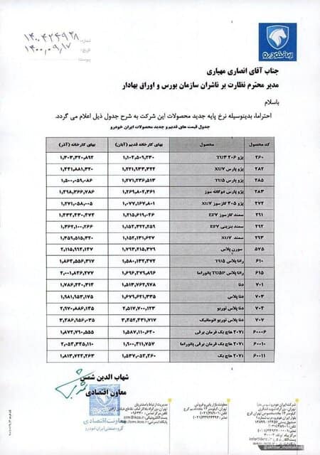 در گروه محصولات ایرانخودرو، در خانواده پژوها، پژو ۲۰۶ tu۳ (با افزایش ۱۹ میلیون و ۸۸۱ هزار و ۱۶۶ تومان) به ۱۳۰ میلیون و ۳۳۲ هزار و ۸۹ تومان، پژو ۲۰۷ i (با افزایش ۲۷ میلیون و ۶۶۶ هزار و ۹۸۰ تومان) به ۱۸۱ میلیون و ۳۷۲ هزار و ۴۲۶ تومان، پژو ۲۰۷i فرمان برقی (با افزایش ۲۸ میلیون و ۵۶۷ هزار و ۹۹۱ تومان) به ۱۸۷ میلیون و ۲۷۹ هزار و ۵۵ تومان، پژو ۲۰۷ i پانوراما (با افزایش ۱۵ میلیون و ۳۹۳ هزار و ۳۳۶ تومان) به ۲۰۵ میلیون و ۴۳۴ هزار و ۵۱۱ تومان، پژو پارس XU ۷ (با افزایش ۲۱ میلیون و ۹۹۴ هزار و ۸۰۰ تومان) به ۱۴۴ میلیون و ۱۸۸ هزار و ۱۳۲ تومان، پژو پارس TU۵ (با افزایش ۲۲ میلیون و ۸۸۲ هزار و ۲۵۷ تومان) به ۱۵۰ میلیون و ۵۰۰ هزار و ۹۰۸ تومان، پژو پارس دوگانهسوز (با افزایش ۲۲ میلیون و ۸۵۶ هزار و ۴۴۲ تومان) به ۱۴۹ میلیون و ۸۳۶ هزا و ۶۷۸ تومان و پژو ۴۰۵ دوگانهسوز XU۷ (با افزایش ۱۹ میلیون و ۳۸۹ هزار و ۰۲۰ تومان) به ۱۲۷ میلیون و ۱۰۵ هزار و ۸۰۰ تومان رسیدهاند.