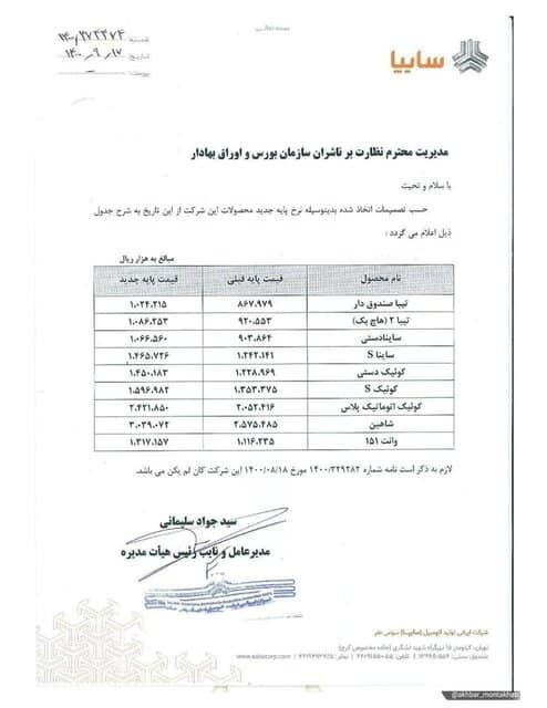 در محصولات ساینا نیز، ساینا دستی (با افزایش ۱۶ میلیون و ۲۶۹ هزار و ۶۰۰ تومان) ۱۰۶ میلیون و ۶۵۶ هزار تومان و ساینا S (با افزایش ۲۲ میلیون و ۳۵۸ هزار و ۵۰۰ تومان) ۱۴۶ میلیون و ۵۷۲ هزار و ۶۰۰ تومان قیمتگذاری شدهاند.