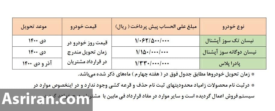 به گزارش پایگاه خبری یاز اکو به نقل از عصر ایران، براساس بخشنامه جديد معاونت بازاريابي و فروش گروه خودروسازی سايپا، متقاضيان خريد دو مدل نیسان آپشنال (تک سوز و دوگانه سوز) و پادرا پلاس مي توانند از ساعت 10 صبح سه شنبه 2 شهریور به صورت 24 ساعته صرفا به سايت فروش اينترنتي محصولات گروه خودروسازي سايپابه آدرس www.saipa.iranecar.com مراجعه و ثبت نام کنند.