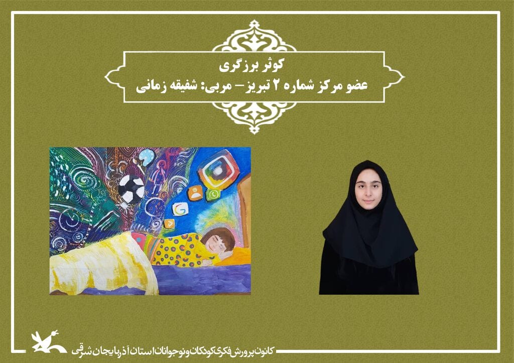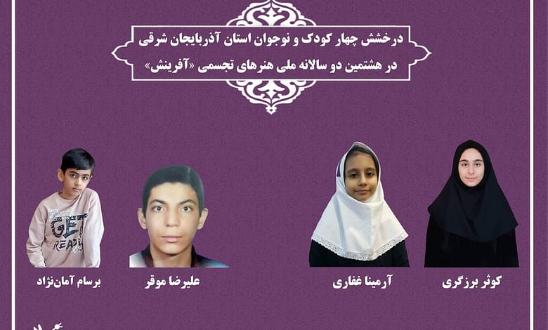 به گزارش پایگاه خبری یاز اکو به نقل از روابط عمومی اداره کل کانون پرورش فکری کودکان و نوجوانان استان آذربایجان شرقی، در هشتمین دوره دوسالانه هنرهای تجسمی از بین ۲۹۳۹ اثر در چهار رشته نقاشی، سفالگری، خوشنویسی و عکاسی در رشته نقاشی گروه سنی نوخوان 7+ “آرمینا غفاری” عضو مرکز مجتمع تبریز در گروه سنی نوجوان 15+ “کوثر برزگری” از مرکز شماره 2 تبریز، “علیرضا موقری” عضو فراگیر مرکز شماره یک تبریز و در رشته سفال گروه سنی نوخوان 7+ “برسام آماننژاد” از مرکز شماره 6 تبریز بعنوان برگزیده معرفی شدن.