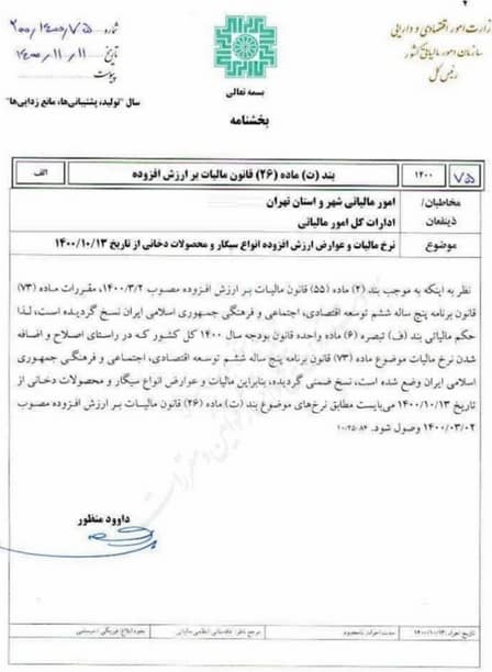 «نظر به اینکه به موجب بند (۲) ماده (۵۵) قانون مالیات بر ارزش افزوده مصوب ۱۴۰۰/۳/۲ ، مقررات ماده (۷۳) قانون برنامه پنج ساله ششم توسعه اقتصادی، اجتماعی و فرهنگی جمهوری اسلامی ایران نسخ گردیده است، لذا حکم مالیاتی بند (ف) تبصره (۶) ماده واحده قانون بودجه سال ۱۴۰۰ کل کشور که در راستای اصلاح و اضافه شدن نرخ مالیات موضوع ماده (۷۳) قانون برنامه پنج ساله ششم توسعه اقتصادی، اجتماعی و فرهنگی جمهوری اسلامی ایران وضع شده است، نسخ ضمنی گردیده، بنابراین مالیات و عوارض انواع سیگار و محصولات دخانی از تاریخ ۱۴۰۰/۱۰/۱۳ میبایست مطابق نرخهای موضوع بند (ب) ماده (۲۶) قانون مالیات بر ارزش افزوده مصوب ۱۴۰۰/۰۳/۰۲ وصول شود»
