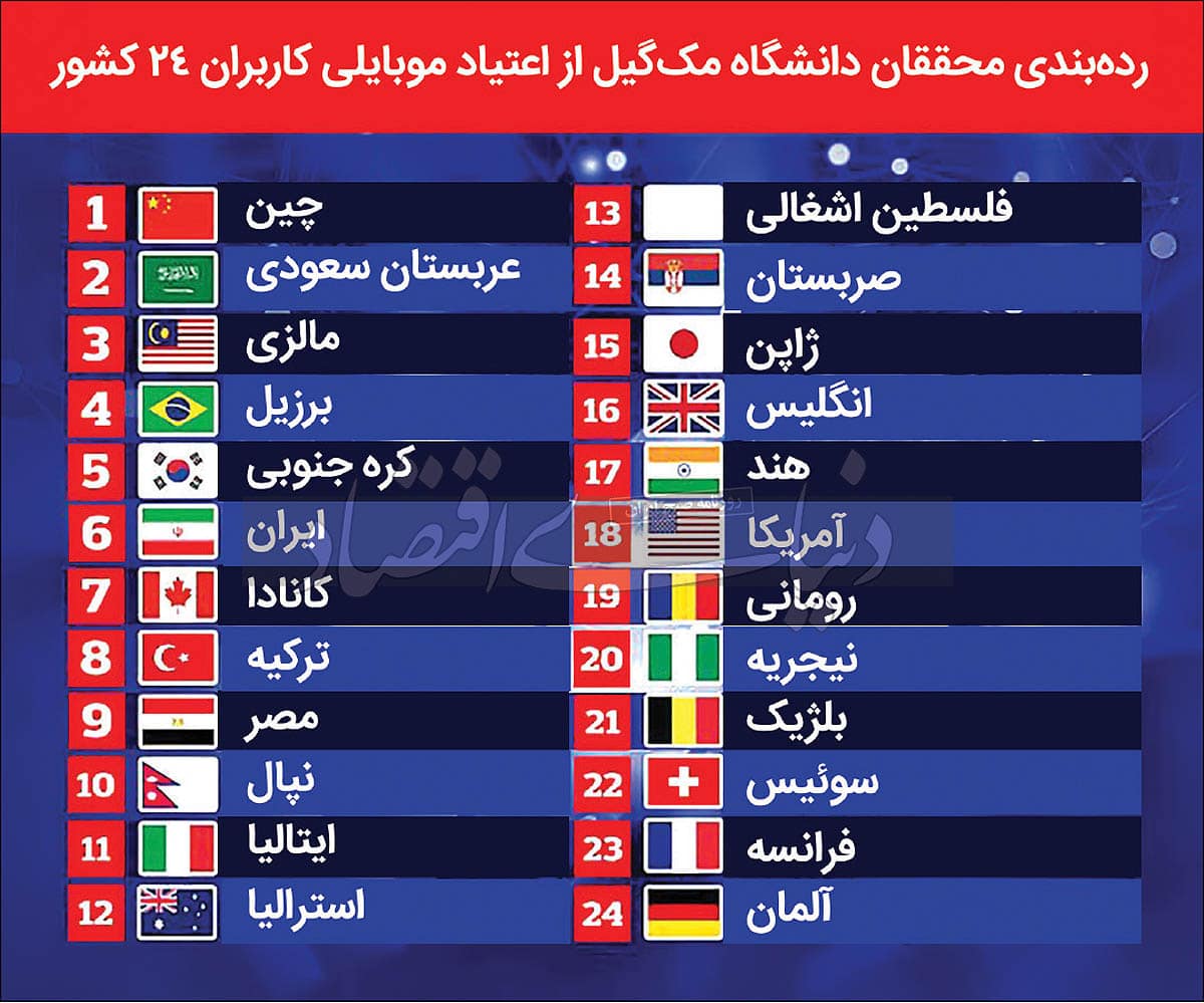 به گزارش پایگاه خبری یاز اکو به نقل از تجارت نیوز، نتایج پژوهشی که توسط محققان دانشگاه مک‌گیل کانادا انجام شده است، نشان می‌دهد کاربران ایرانی در رتبه ششم اعتیاد به استفاده از گوشی موبایل قرار دارند. از میان ۲۴کشور مورد بررسی، کشورهای چین، عربستان سعودی و مالزی در رده‌های اول تا سوم هستند و کشورهایی مانند آمریکا و آلمان که از جمله کشورهای در حال توسعه در عرصه دیجیتال به شمار می‌آیند، در بخش‌های انتهایی جدول جای گرفته‌اند.