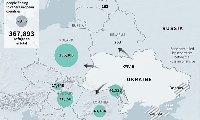 به گزارش پایگاه خبری یاز اکو؛ از بین ۳۶۷ هزار پناهجوی اوکراینی نزدیک به ۱۵۷ هزار نفر به سمت لهستان، ۷۱ هزار نفر به مجارستان،۴۳ هزار نفر به رومانی و ۴۱ هزار نفر نیز به مولداوی پناه بردهاند.
