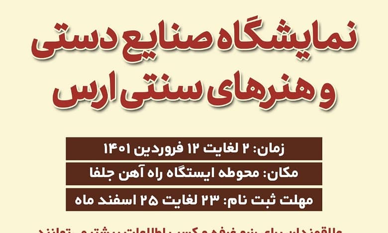 رئیس اداره میراثفرهنگی، گردشگری و صنایعدستی شهرستان جلفا در ادامه به برپایی نمایشگاه صنایعدستی و هنرهای سنتی ارس طی ایام نوروز 1401 اشاره کرد و گفت: «این نمایشگاه از روز 2 الی 12 فروردینماه 1401 در محوطه راهآهن جلفا، آثار هنرمندان صنایعدستی را به نمایش خواهد گذاشت.»
