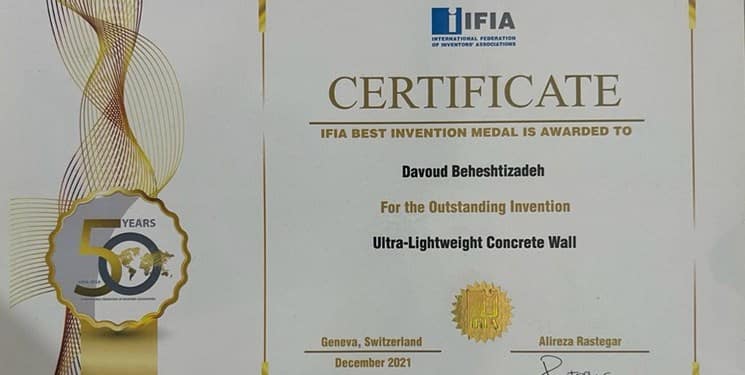 به گزارش پایگاه خبری یاز اکو به نقل از خبرگزاری فارس، اختراع جهانی داود بهشتی زاده با عنوان ساخت پانل دیواری و بلوک فوق سبک بتنی دیواری پرمقاومت و عایق موفق به کسب مدال طلا و جایزه ویژه بهترین اختراع فنی مهندسی فدراسیون بین المللی مخترعین IFIA در سال ۲۰۲۱ شد.