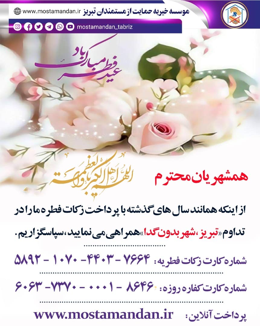 مدیرعامل موسسه خیریه حمایت از مستمندان تبریز افزود: نیکوکاران میتوانند با مراجعه به پایگاه اینترنتی این مؤسسه به نشانی www.mostamandan.ir بصورت آنلاین نیز زکات فطره و کفاره روزه خود را پرداخت و سهمی در کمک به نیازمندان شهرمان داشته باشند.