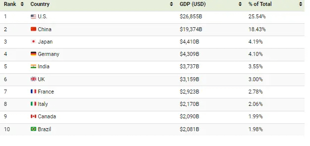 چین با پیشبینی تولید ناخالص داخلی 19.4 تریلیون دلاری در سال 2023 در جایگاه دوم ثابت باقی مانده است. پنج اقتصاد برتر دنیا اکثرا از سال 2022 در موقعیتهای مشابه باقی ماندهاند؛ بهغیر از یک استثنای قابل توجه.