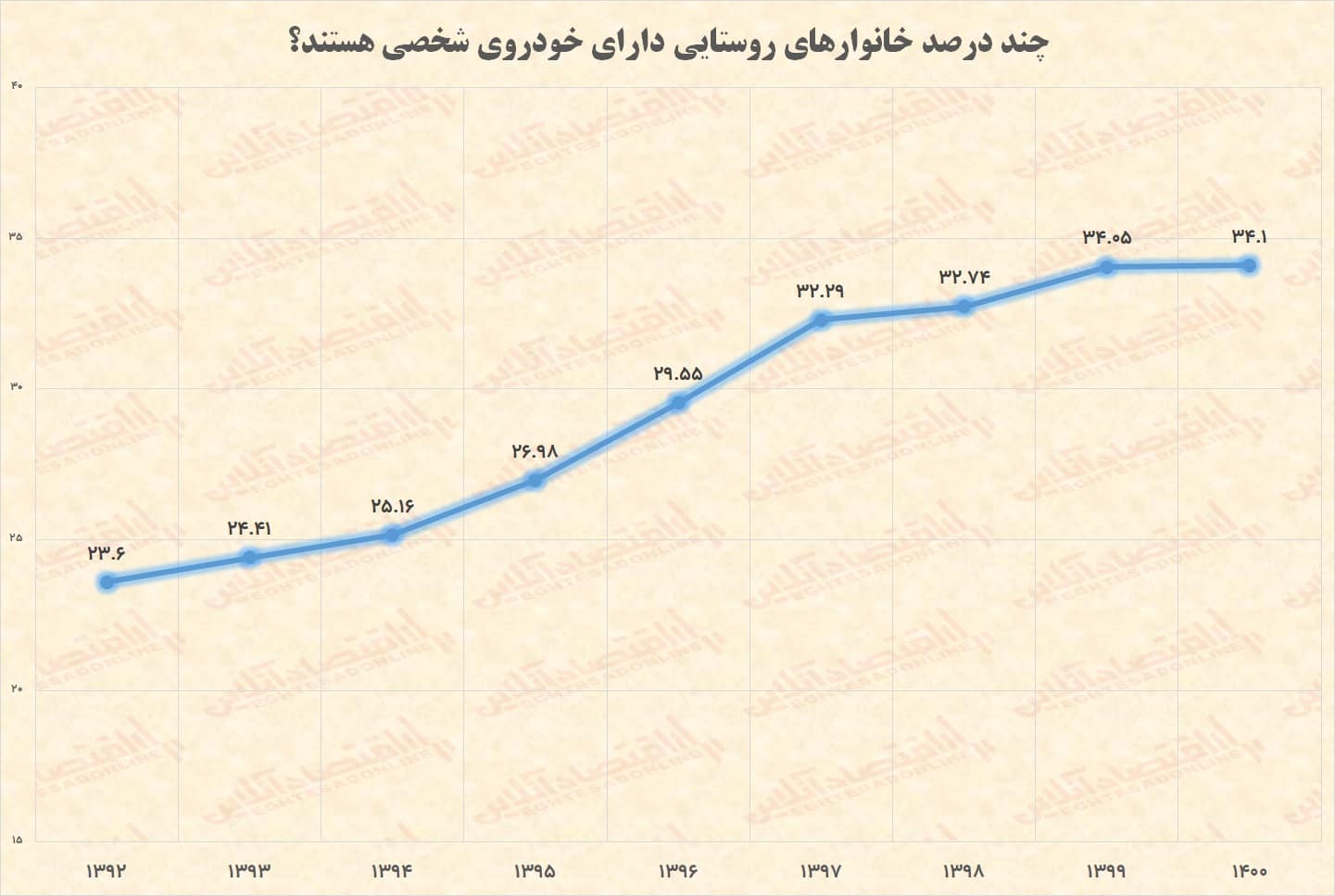این روند تقریبا برای خانوارهای روستایی نیز قابل مشاهده است اما کمی شرایط نسبت به خانوارهای شهری بهتر است. درصد خانوارهای روستایی دارای خودروی شخصی از ۲۳.۶ درصد در سال ۱۳۹۲ به ۳۲.۲۹ درصد در سال ۱۳۹۷ رسید. اما از سال ۱۳۹۷ این روند افزایشی به شدت کاهش پیدا کرده و در سال گذشته ۳۴.۱ درصد خانوارهای روستایی دارای خودروی شخصی بودند.