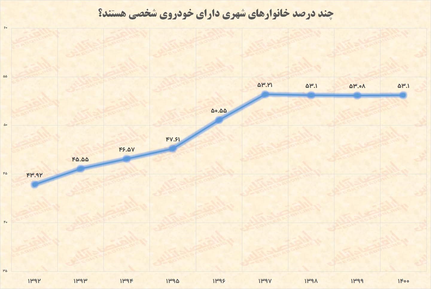 بر اساس آمارهای موجود در سال ۱۳۹۷، ۵۳.۲۱ درصد خانوارهای شهری کشور دارای خودروی شخص بودند و از سال های ۱۳۹۲ تا ۱۳۹۷ این روند افزایشی بوده است. اما از سال ۱۳۹۷ تا سال گذشته عملاً درصد خانوارهای دارای خودروی شخصی بدون تغییر باقی مانده است.