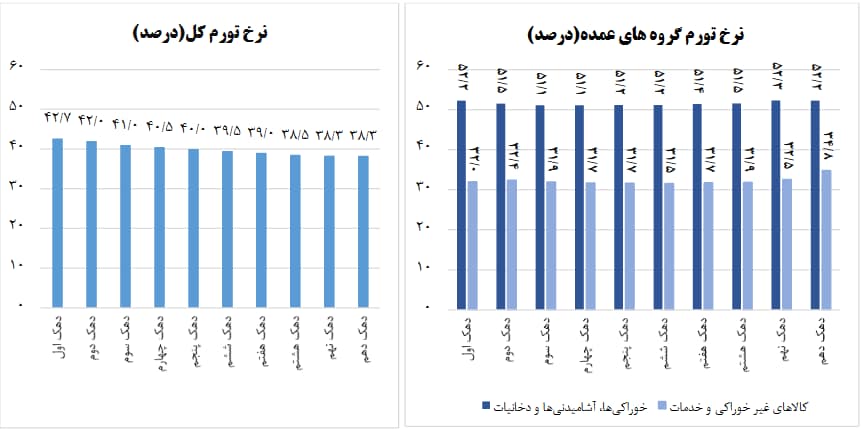 طبق اعلام مرکز آمار نرخ تورم در خردادماه ۱۴۰۱ برابر ۳۹.۴ درصد بود که در دهکهای مختلف هزینهای در بازه ٣٨.٣ درصد برای دهک نهم و دهم تا ٤٢.٧ درصد برای دهک اول نوسان دارد.