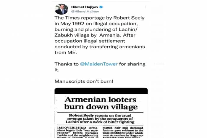 حکمت حاجی اف با انتشار تصویر گزارش روزنامه «تایمز» در مورد اشغال روستاهای آذربایجان توسط ارامنه نوشت: گزارش رابرت سیلی در روزنامه “تایمز” در سال ۱۹۹۲ میلادی در خصوص اشغال غیرقانونی، سوزاندن و غارت روستای زابوک در لاچین توسط ارمنستان در سال تقدیم می گردد. پس از اشغال لاچین، ارامنه خاورمیانه به طور غیرقانونی در این مناطق اسکان داده شدند. دستنوشته ها نمی سوزند!