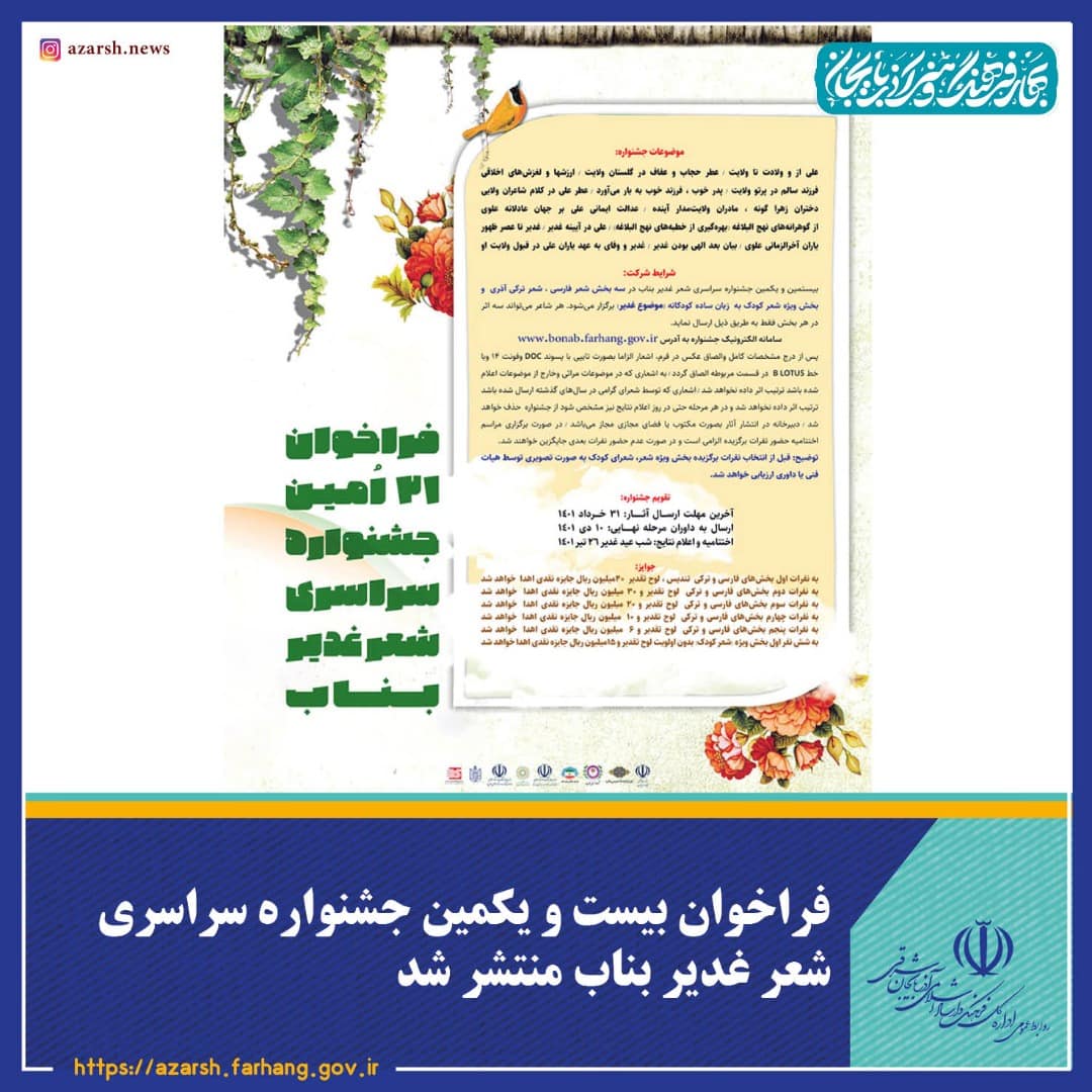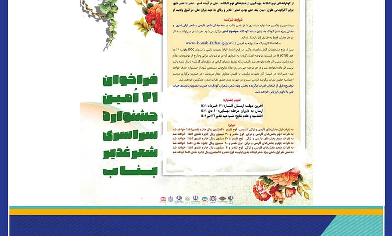 همچنین هر شاعر میتواند در هر بخش سه اثر از طریق سامانه الکترونیک جشنواره به آدرسwww.bonab.farhang.gov.ir ارسال نماید.