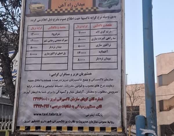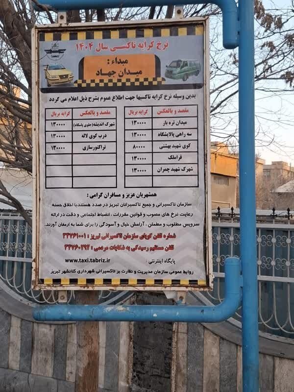 در راستای اطلاع رسانی شفاف کرایه تاکسی ها در سال 1404 ، همزمان با اولین روز سال نو ، نرخ کریه مسیرهایی که مبدا و مقصد مشخص دارند در تابلوهای کرایه ها نصب و در دسترس عموم شهروندان محترم و رانندگان زحمتکش تاکسی ها قرار گرفت.