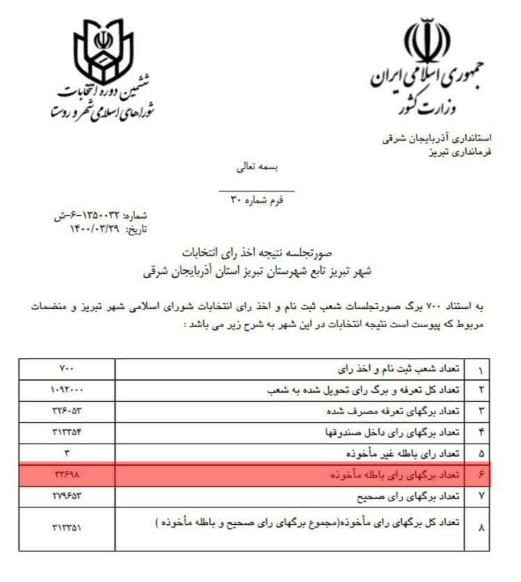 به گزارش پایگاه خبری یاز اکو به نقل از مملکت آنلاین، نتایج ششمین انتخابات شورای اسلامی شهر تبریز امروز( ۲۹ خرداد) اعلام شد که طبق آن آرای باطله با  ۳۳۶۹۸ رأی، رتبه دوم را به خود اختصاص داد!