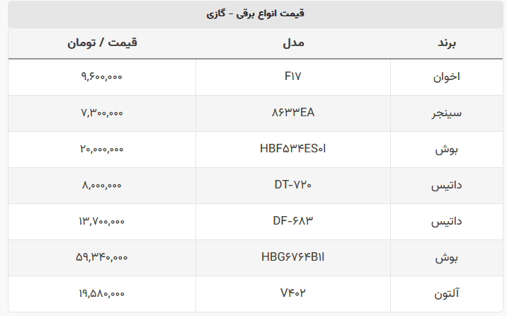 براساس گزارش اقتصادآنلاین از بازار لوازم خانگی قیمت فر توکار اخوان مدل F۱۷ مبلغ ۹,۶۰۰,۰۰۰ تومان است این درحالیست که قیمت فر توکار بوش مدل HBG۶۷۶۴B۱I مبلغ ۵۹,۳۴۰,۰۰۰ تومان اعلام شده است.