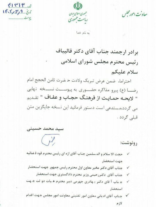 احتراماً ضمن عرض تبریک ولادت حضرت ثامن الحجج امام رضا (ع) پیرو مذاکره حضوری به پیوست نسخه نهایی «لایحه حمایت از فرهنگ حجاب و عفاف» تقدیم میگردد مستدعی است دستور فرمائید این نسخه جایگزین متن قبلی گردد.