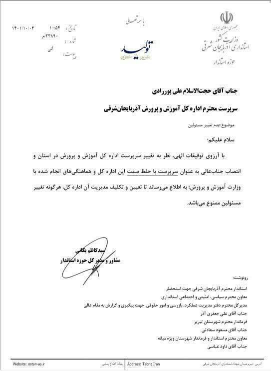 یاز اکو - به دنبال تغییر سرپرست آموزش و پرورش آذربایجان شرقی و انتصاب حجت الاسلام پوررادی به این سمت استانداری آذربایجان شرقی هر گونه تغییر مسئولین این اداره کل را ممنوع کرد.