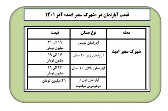 قیمت هر واحد آپارتمان با سن زیر 10 سال در شهرک سفیر امید بین 17 میلیون تا 19 میلیون تومان متغیر است.