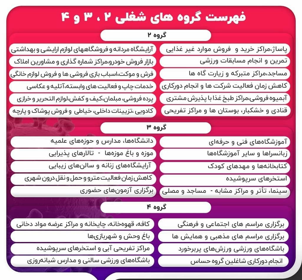 حریرچی ادامه داد: مراکز فروش ملزومات و تجهیزات بدنسازی و ورزشی، فروشندگان طلا و جواهر و…، فروش کالاهای دست دوم و سمساری و آموزشگاههای رانندگی و… همه در شهرهای قرمز باید تعطیل باشند. اینها مشاغل گروه دو هستند که باید در شهرهای قرمز تعطیل باشند.