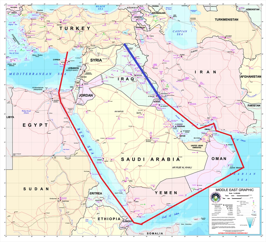 شرح نقشه: ترکیه برای رسیدن به خلیج فارس، یا باید از دریا و مسیری طولانی (خط قرمز) را بپیماید یا از خشکی و از طریق ایران به آن برسد. راه جدیدی که اردوغان از آن سخن می گوید، مسیر مستقیم ترکیه به خلیج فارس از طریق عراق است (خط آبی) که هم برای ترکیه به صرفه است و هم عواید ترانزیتی زیادی برای عراق دارد و ایران عملاً از مسیر ترکیه به خلیح فارس کنار می رود.